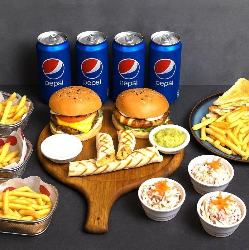 250 Q.RClassic meat burger, chicken b burger, chicken fajita wraps plate, crepaway club plate, fries, coleslaw salad and soft drinks
