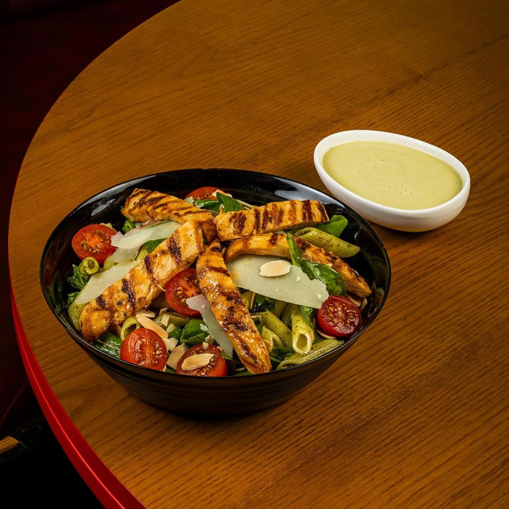 45 ر.قبيني باستا-طماطم كرزية-جبن بارميزن-جرجير-بيستو-دجاج مشوي وصلصة الحبق