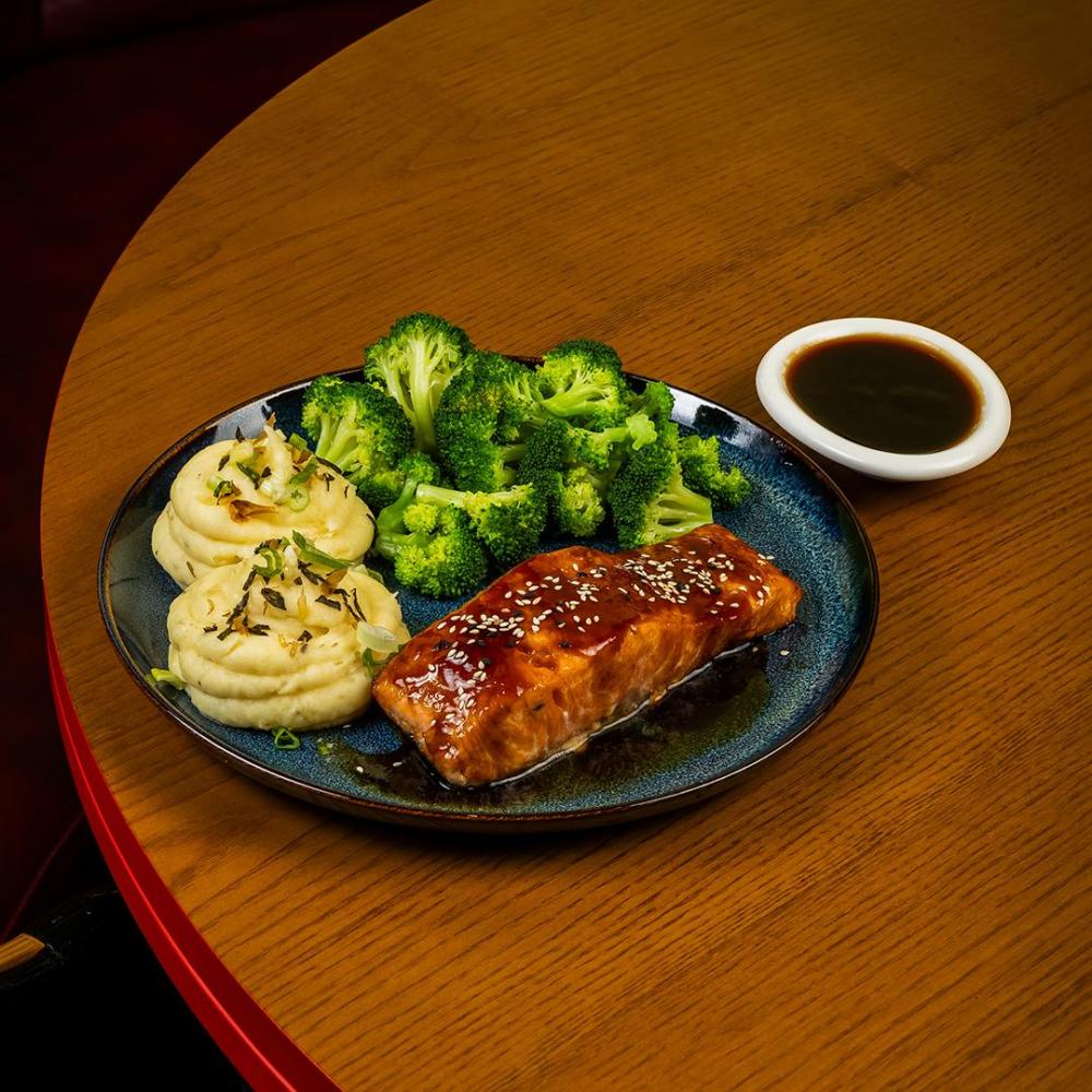 قطعة سالمون مشوية-بصل اخضر-بروكولي -صلصة الترياكي -بطاطا مهروسة